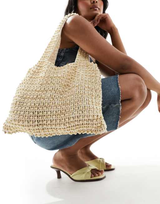 Glamorous – Gräddvit, virkad toteväska med pärlor och axelband