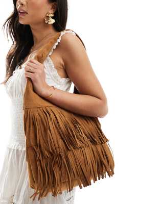 Glamorous – Ljusbrun axelremsväska i mockaimitation med fransar