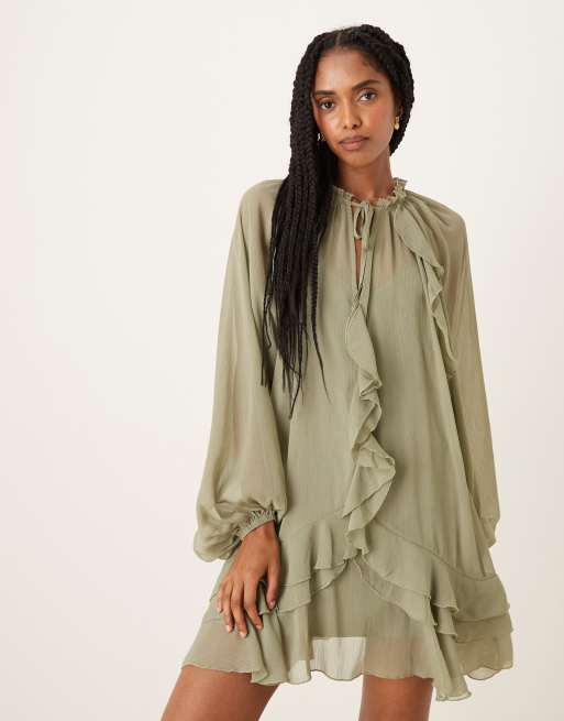 Glamorous – Salviagrön miniklänning i chiffong och bohostil med volang