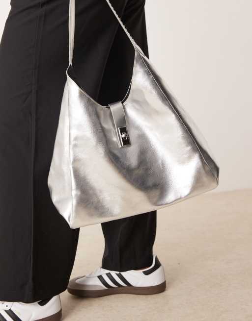 Glamorous – Silverfärgad, stor och slouchy toteväska med spänne