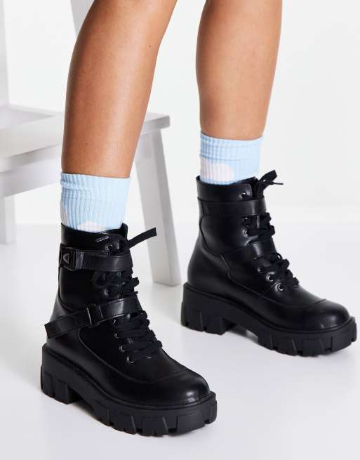 Glamorous – Svarta platta ankelboots med snörning och spännen