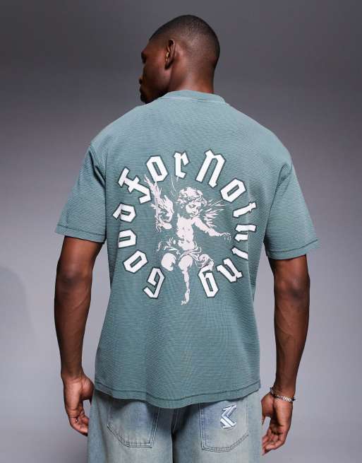 Good For Nothing – Khakigrön, våfflad t-shirt med avslappnad passform med logga på bröst och rygg