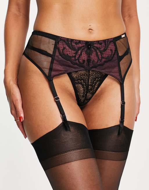 Gossard – VIP Indulgence – Svarta och vinröda strumpebandsbehållare med spetsdetaljer
