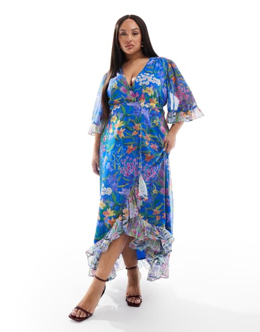 Hope & Ivy Plus – Blå omlottklänning i maxilängd med volangärmar och knytmidja
