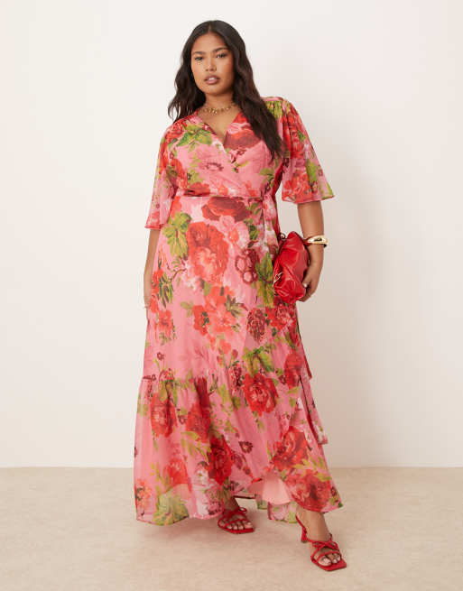 Hope & Ivy Plus – Röd och flerfärgad omlottklänning i maxilängd med utsvängda ärmar och knytning i midjan