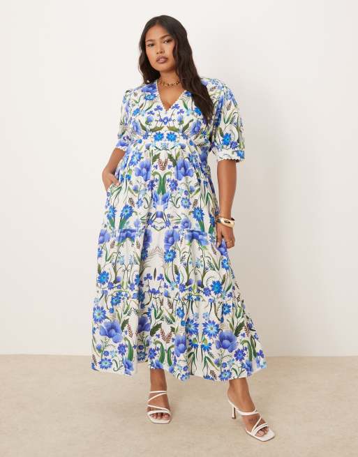 Hope & Ivy Plus – Vit klänning i midilängd med blått mönster, v-ringning och puffärmar
