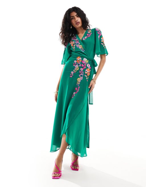Hope & Ivy – Grön, broderad maxiklänning med omlottdesign