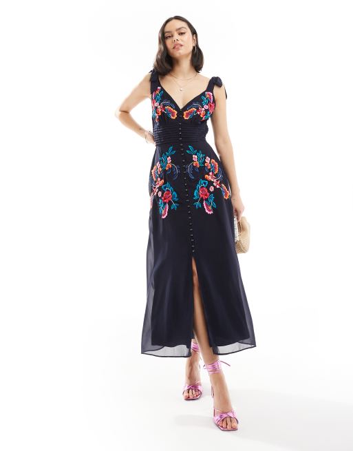 Hope & Ivy – Marinblå midiklänning med broderi och knytband på axlarna