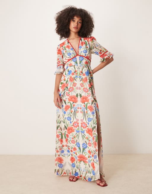 Hope & Ivy – Röd, flerfärgad, mönstrad maxiklänning med volangärmar, lårhög slits och öppen rygg