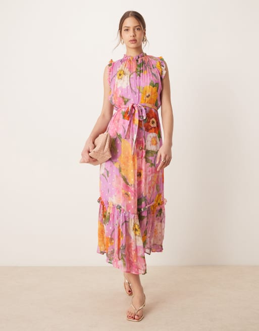 Hope & Ivy – Rosa, mönstrad midiklänning med hög krage, volang och knytning i midjan