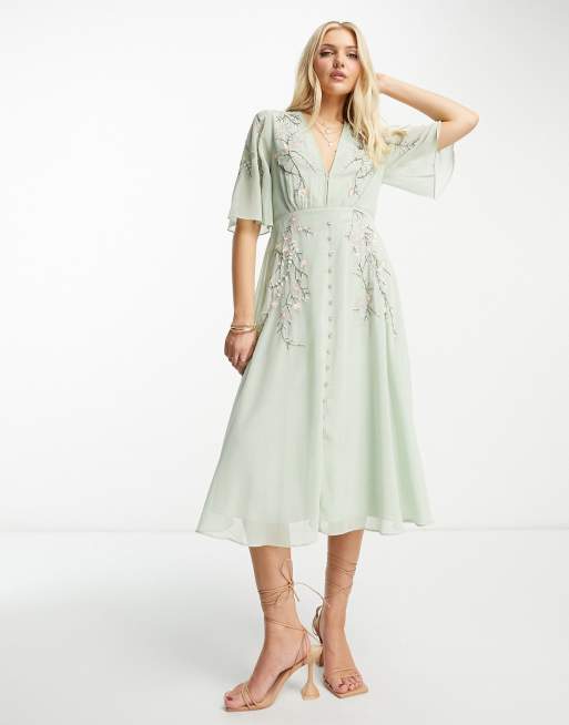 Hope & Ivy – Salviagrön midiklänning med utsvängd ärm, djup halsringning och broderi