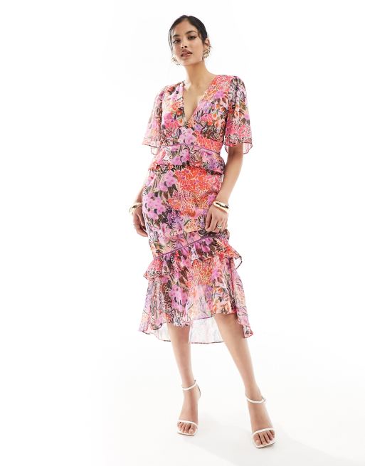 Hope & Ivy – Syrénlila, blommig midiklänning med djup halsringning och volang