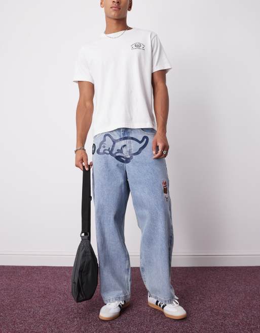 ICECREAM – Ljusblå, baggy jeans med tryck med springande hund och påsytt märke