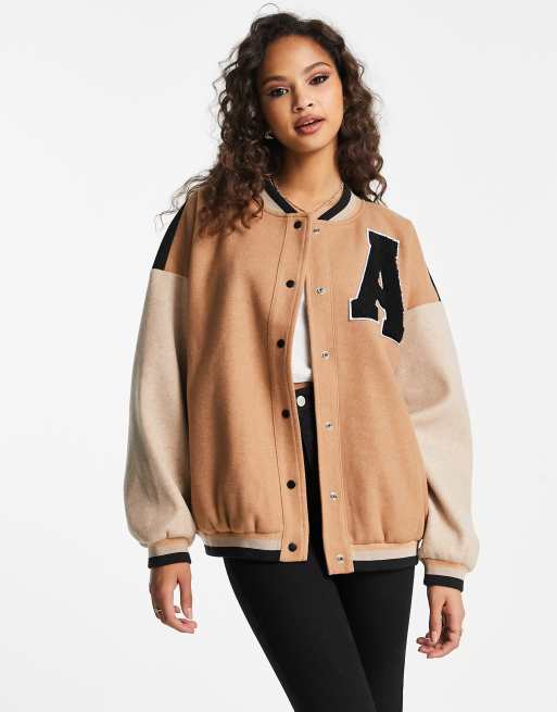 In The Style – Kamelbrun bomberjacka i oversize och collegestil med kontrastdetaljer
