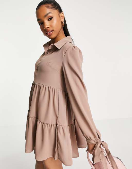 In The Style x Dani Dyer – Brungrå, panelsydd skjortklänning med rosetter vid manschetterna