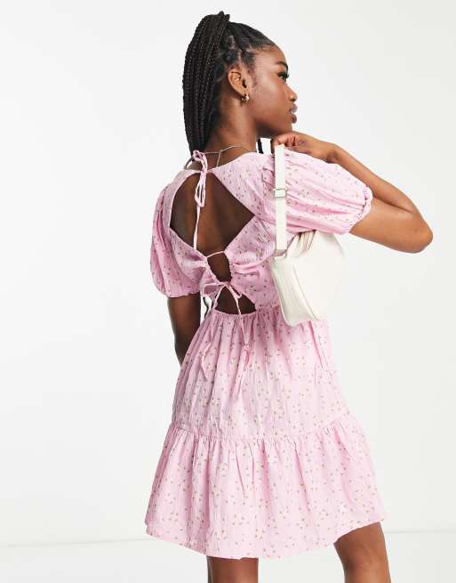 Influence – Rosa blommig miniklänning med puffärmar och knytning baktill