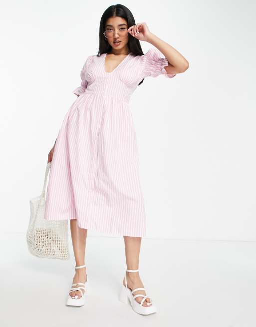 Influence – Rosa ginghamrutig maxiklänning med v-ringning och puffärmar