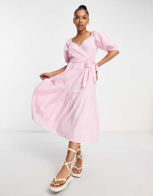 Influence – Rosa panelsydd midiklänning med puffärmar och ginghamrutigt mönster