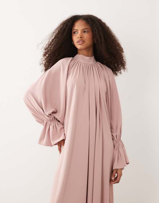 IYAL – Ljusrosa maxiklänning med volym, hög krage och muddar på ärmarna
