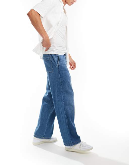 Jack & Jones – Eddie – Mellanblå, tvättade jeans med ledig passform och dragsko