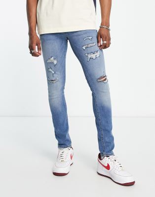 Jack & Jones Intelligence – Liam – Blå skinny jeans med revor
