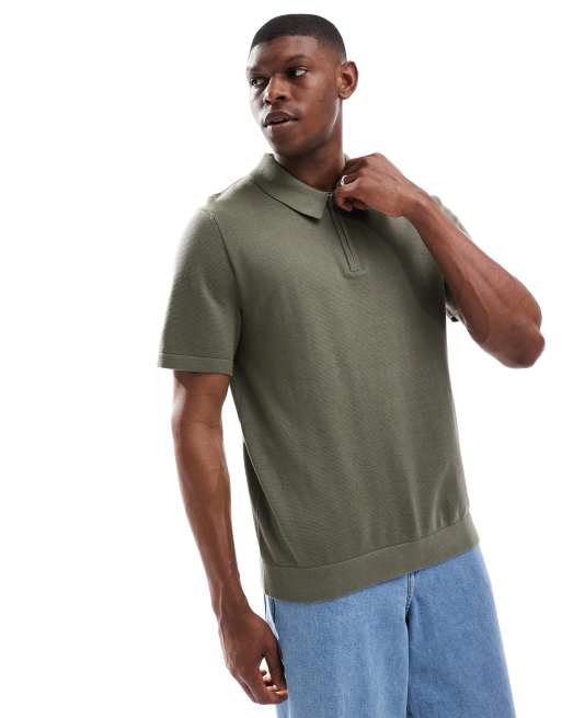 Jack & Jones – Kakifärgad, stickad pikétröja med dragkedja