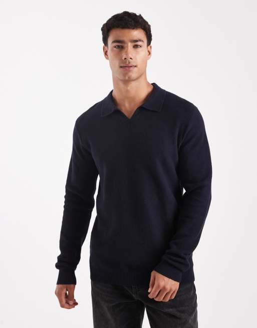 Jack & Jones – Premium – Marinblå stickad pikétröja med lång ärm
