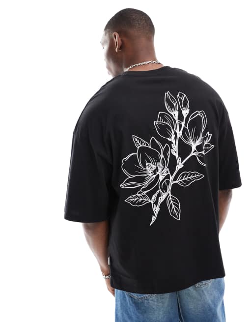 Jack & Jones – Svart t-shirt i extra oversize med blomtryck baktill