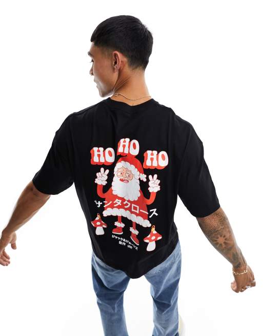Jack & Jones – Svart t-shirt i oversize med jultomtetryck baktill