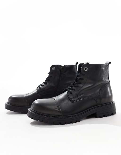 Jack & Jones – Svarta, grova läderboots med snörning