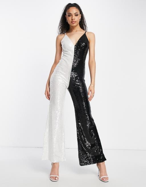 Jaded Rose – Utsvängd jumpsuit med smala axelband, djup ringning och kontrastfärgade paljetter i 70-talsstil