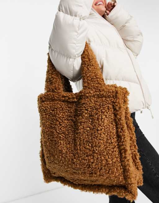 Jayley – Ljusbrun, stor shoppingväska i fårskinnsimitation