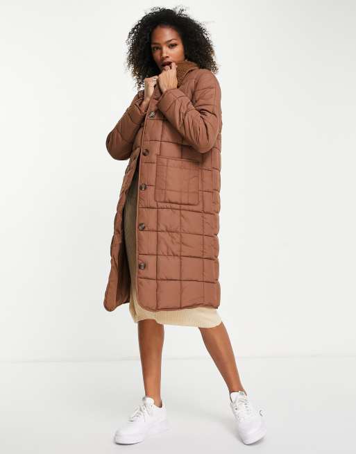 JDY – Brun, kviltad kappa i lång modell med teddykrage