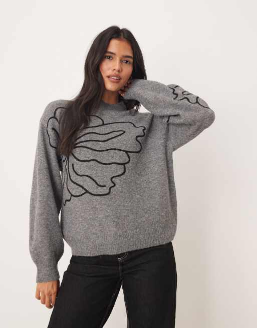 JDY – Mörkgrå, blommig tröja med dekorativ söm