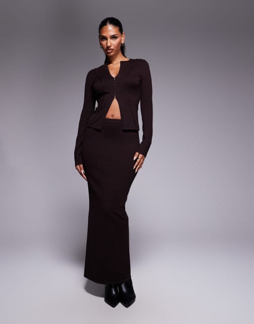 Kaiia – Brunt, stickat set med långärmad topp med spänne och rak maxikjol