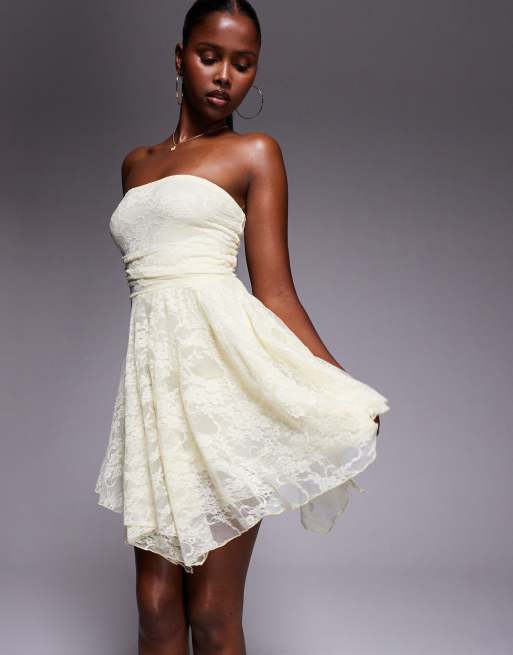 Kaiia – Citrongul, åtsmitande spetsklänning i två lager med bandeau-ringning och rynkad asymmetrisk kant, exklusivt hos ASOS