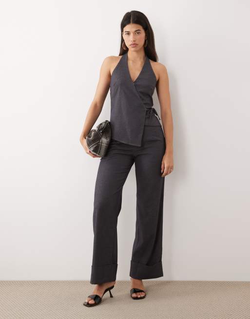 Kaiia – Exklusivt – Mörkgrå, figursydda, vävda byxor med stretch, vida ben och uppvikt kant, del av set