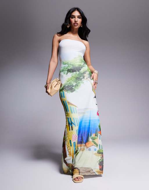 Kaiia – Flerfärgad, åtsmitande maxiklänning med två lager, bandeauringning och landskapsmönster, exklusivt hos ASOS