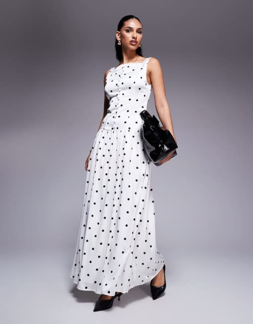 Kaiia – Monokrom maxiklänning i satin med hög krage, knäppning, sänkt midja, fyrkantig ringning och prickigt mönster, exklusivt hos ASOS