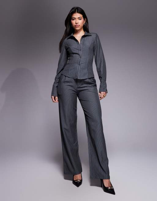 Kaiia – Mörkgrått, kritstrecksrandigt set med figursydda byxor och skjorta med knäppning, exklusivt hos ASOS