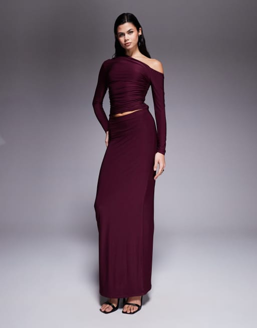 Kaiia – Mörkrött set i två lager med åtsmitande, långärmad topp med bara axlar och maxikjol, exklusivt hos ASOS