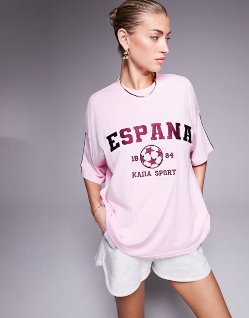 Kaiia – Sport – Rosa och vinröd t-shirt i bomullsrikt tyg och oversize med rund halsringning och "Espana"-tryck