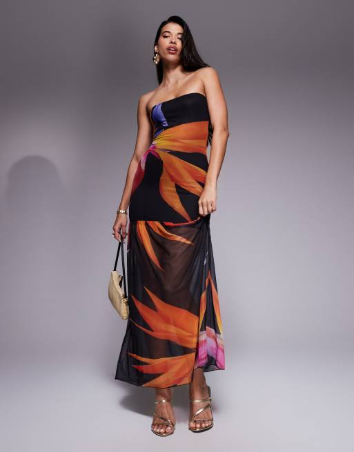 Kaiia – Svart, blommig, åtsmitande maxiklänning i mesh och dubbla lager med indragen, skir fåll och bandeauringning, exklusivt hos ASOS