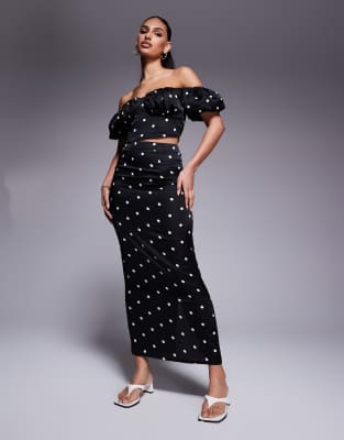 Kaiia – Svart, exklusiv maxikjol i satin med bodycon-passform och prickigt mönster, del av set
