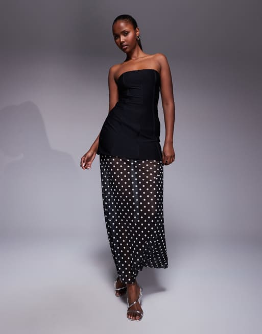 Kaiia – Svartvit, prickig, strukturerad maxiklänning med bandeauringning, kontrasterande kjol och skir fåll, exklusivt hos ASOS