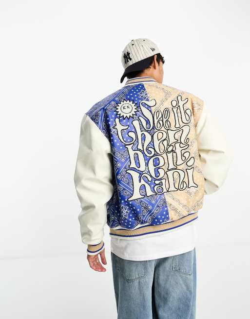Karl Kani – Blå och beige, paisleymönstrad collegejacka med tvådelad design i retrostil