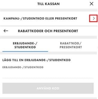 Du måste uppge koden precis som du fick den, utan mellanslag. Skriv eller klipp ut/klistra in koden i 'Erbjudande/studentkod eller Presentkort'-rutan.