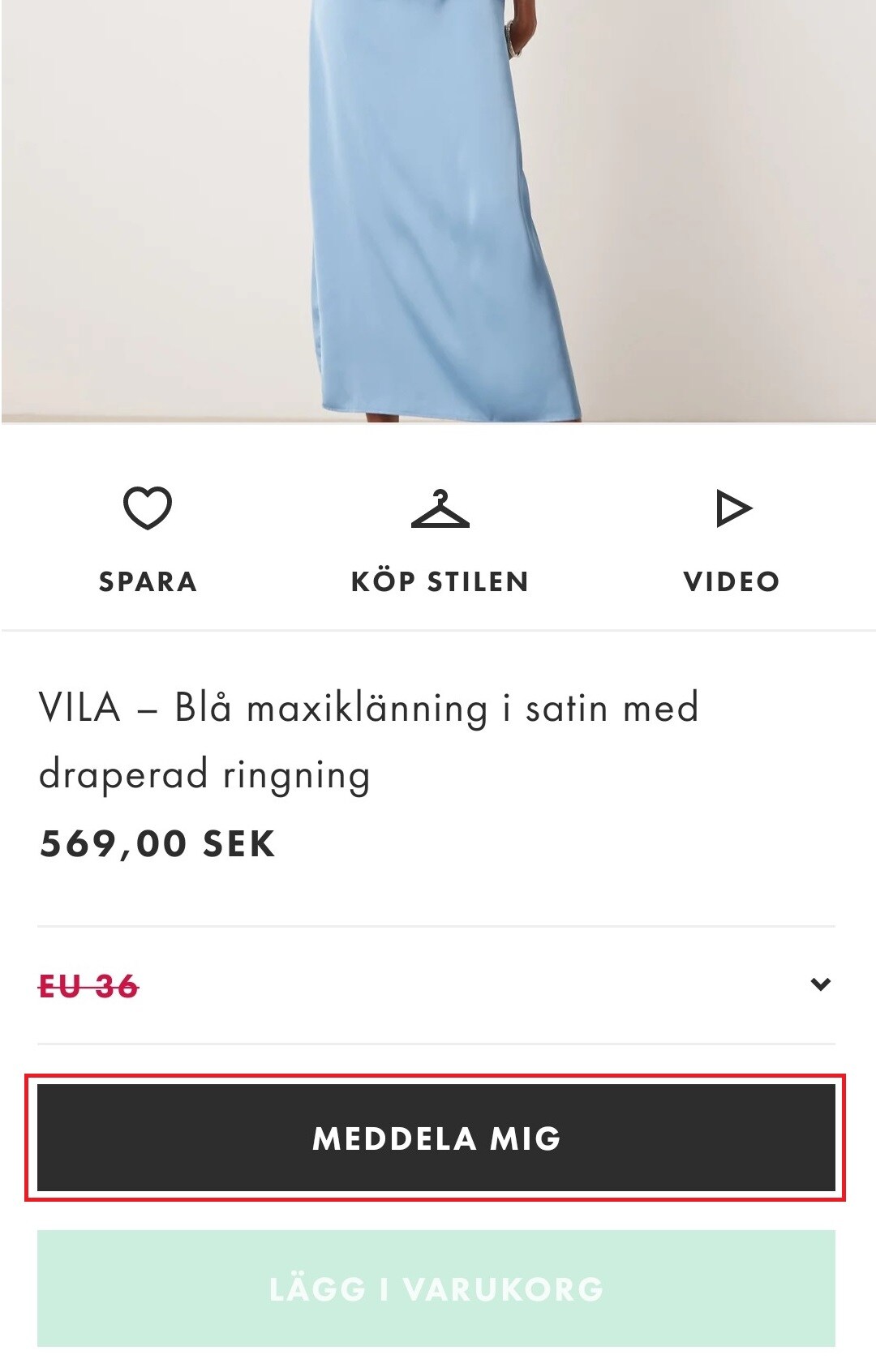 Vi kan inte garantera att en artikel kommer tillbaka i lager när den sålt slut, men du kan välja att bli meddelad om det händer. Välj bara den storlek du vill ha och tryck på knappen Meddela mig – om produkten blir tillgänglig i storleken du valt meddelar vi dig. Du får ett mejl om du bett oss att meddela dig via ASOS webbplats och en pushnotis om du använde ASOS app. Om du vill veta mer om att ställa in dina notiser kan du klicka på den här länken.