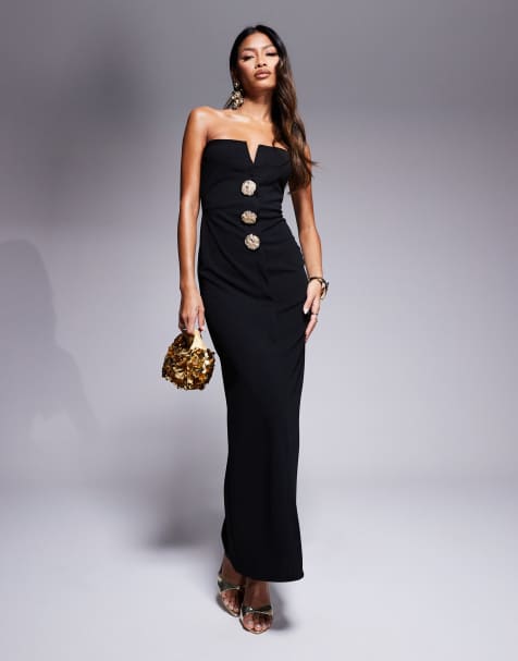 ASOS DESIGN – Premium – Svart maxiklänning i spets med bandeauringning och vid, strukturerad kjol