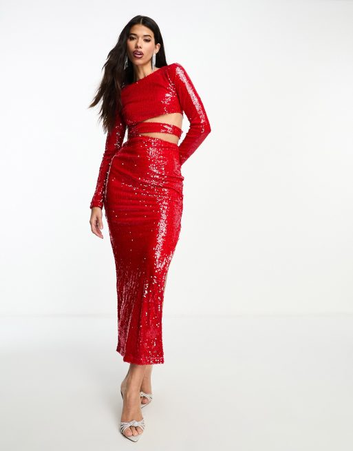 Kyo The Brand – Röd maxiklänning med långa ärmar, paljetter och utskurna detaljer